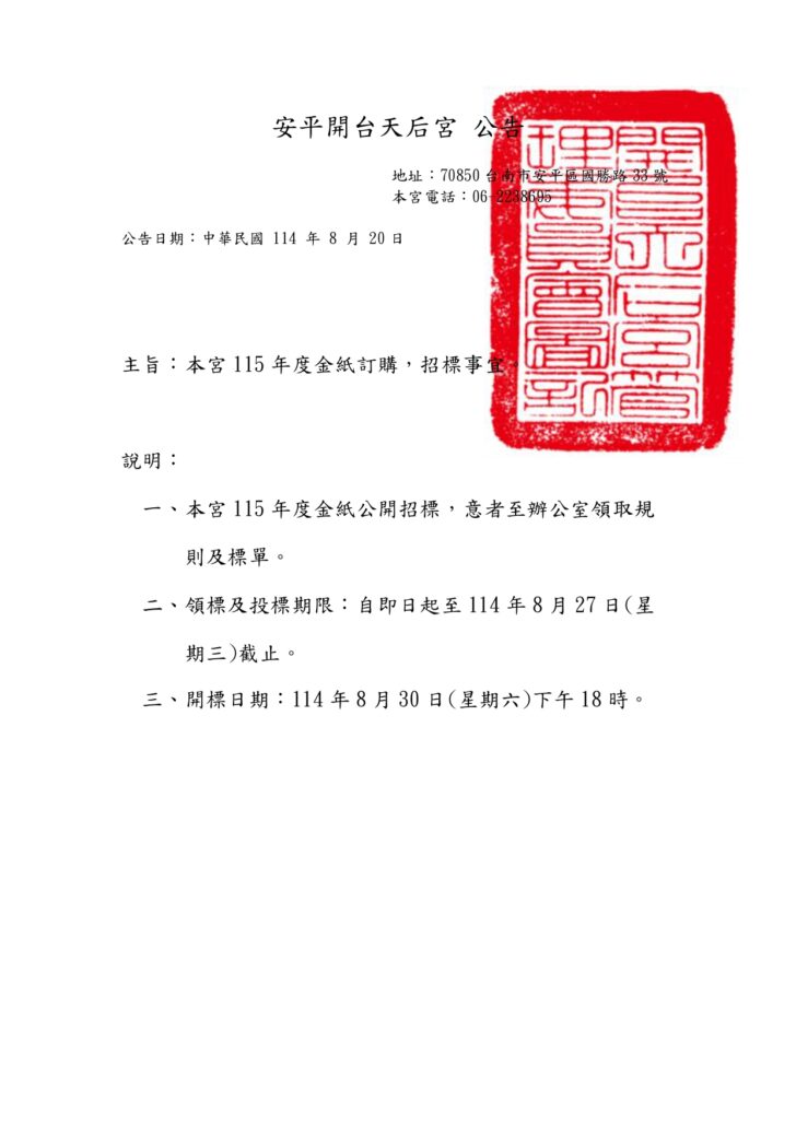 114/08/20 安平開台天后宮115年度金紙訂購,公開招標公告