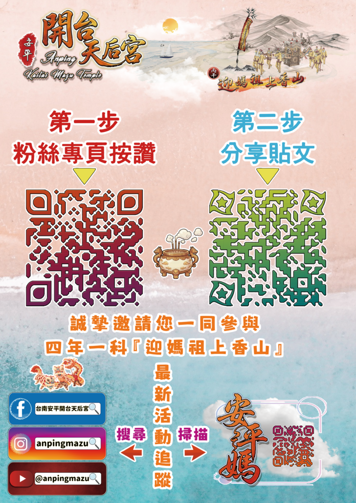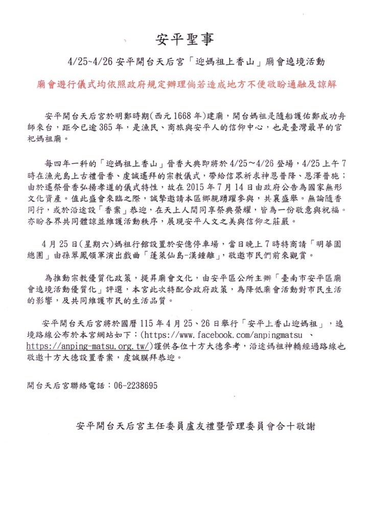 本次活動為提升廟會文化品質,特配合安平區公所舉辦「台南市安平區廟會遶境活動優質化」評選之政策,盡可能降低廟會活動對市民生活之影響,如造成您的不便,敬請見諒